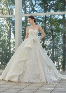 アシンメトリーのフリルから煌びやかなビージングレースが輝く美しい一着。