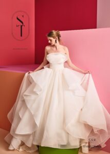 計算されたボリュームとザラつきのある風合いが素敵なガザサテンオーガンジーの軽やかな透け感が、